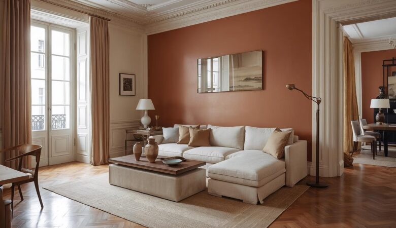 Dans un salon par exemple, un mur terracotta derrière le canapé crée immédiatement un point focal chaleureux. Associé à :